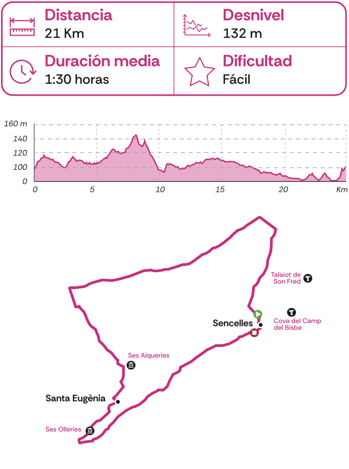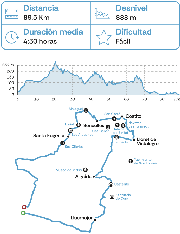 Esta ruta es un agradable recorrido por el campo mallorquín. Comenzando por el pueblo de Sencelles, el recorrido circula por carreteras tranquilas rodeadas de exuberantes paisajes. El trayecto brinda la oportunidad de explorar la autenticidad de la región, disfrutando de la serenidad del entorno natural. Llegando a Santa Eugènia, se puede apreciar la arquitectura tradicional mallorquina. Se trata de una ruta perfecta para ciclistas de diferentes niveles, ya que ofrece un terreno mayormente llano con unas colinas muy suaves.