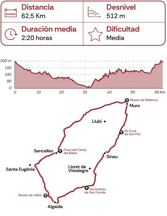 Las carreteras por las que discurre la ruta permiten disfrutar de la tranquilidad del campo y de los pequeños pueblos que hay a lo largo del camino. Dependiendo de la sección de la carretera, se pueden encontrar colinas suaves, zonas rurales pintorescas e incluso pequeñas áreas boscosas, lo que añade un elemento de diversidad al recorrido. A su vez, la ruta tiene un importante elemento cultural, ya que permite hacer paradas en varios vestigios de épocas pasadas como la cueva del Camp del Bisbe o el yacimiento de Son Fornés.