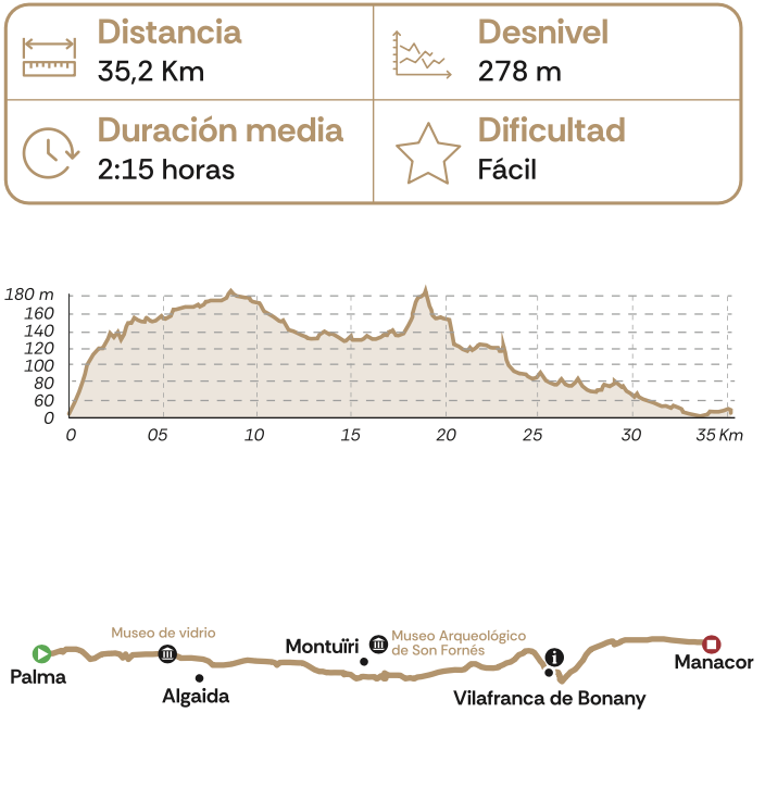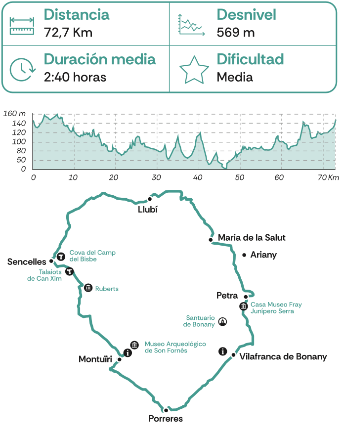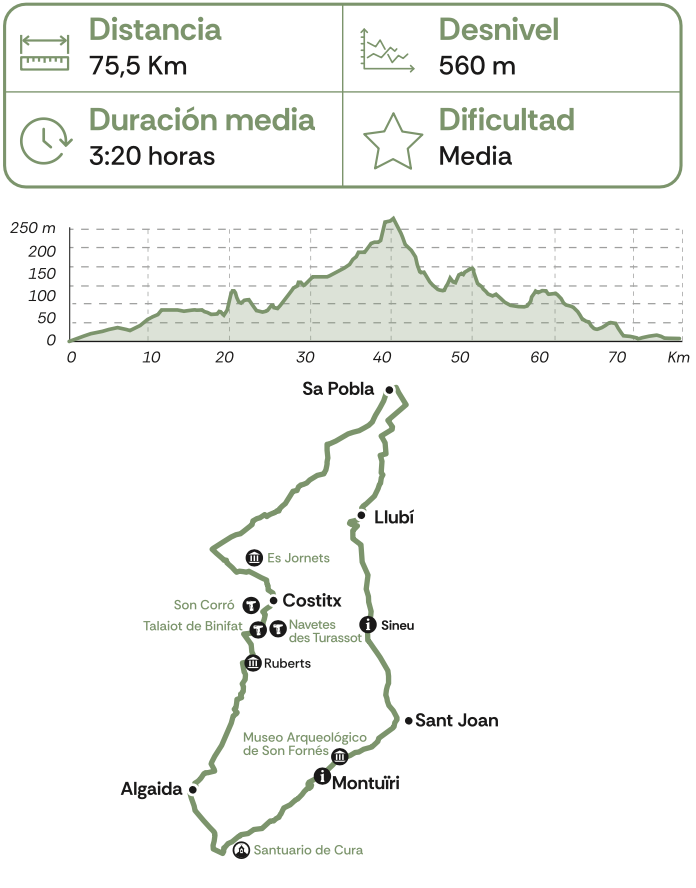 Combinación de carreteras escénicas y caminos rurales. Permite pedalear por un paisaje encantador, descubriendo la autenticidad del campo del Pla. El recorrido atraviesa áreas más rurales y tradicionales, en las que se puede disfrutar de la cultura local y la arquitectura típica de la isla. La ruta permite adentrarse en el legado talayótico del Pla, pudiendo visitar los talaiots de Can Xim y el museo arqueológico de Son Fornés.